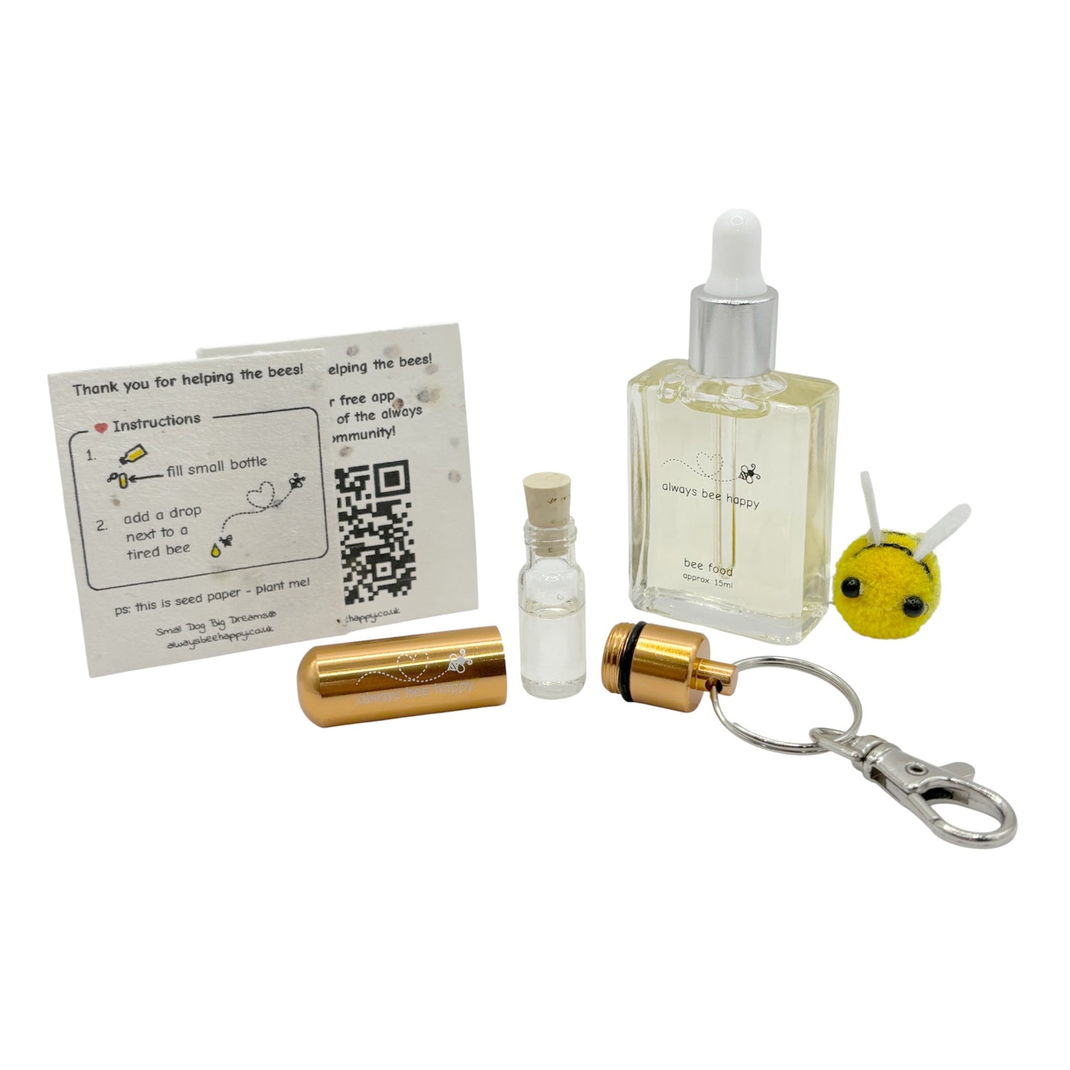 Valentine's Day Bee Revival Kit Gift - 2 x Keyrings, 15ml Dropper Bottle with Syrup, Seed Paper, Eco Packaging, Free Gift Wrap