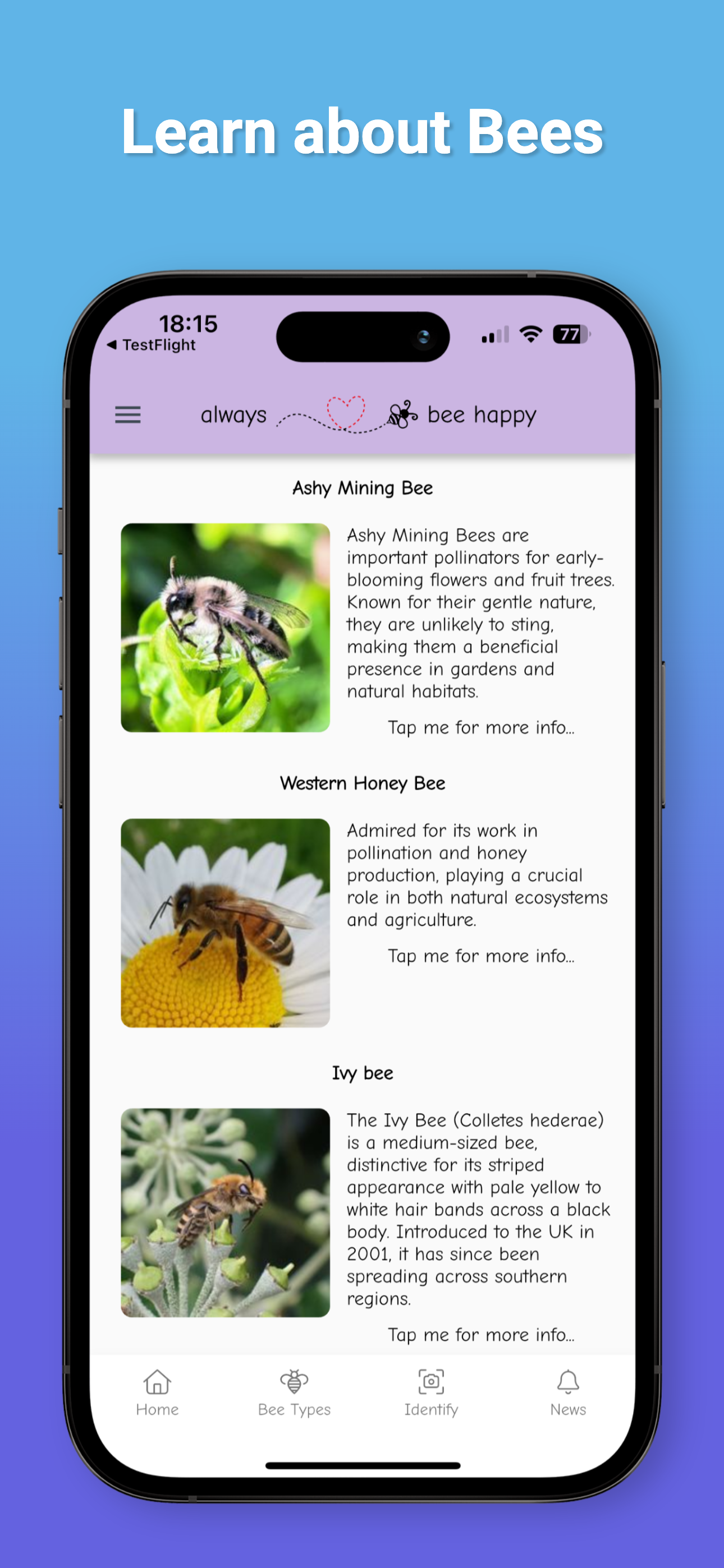 - Stay Up-to-Date: Receive the latest news on bee conservation and environmental efforts directly through the app, helping you stay informed and engaged with the global bee community.